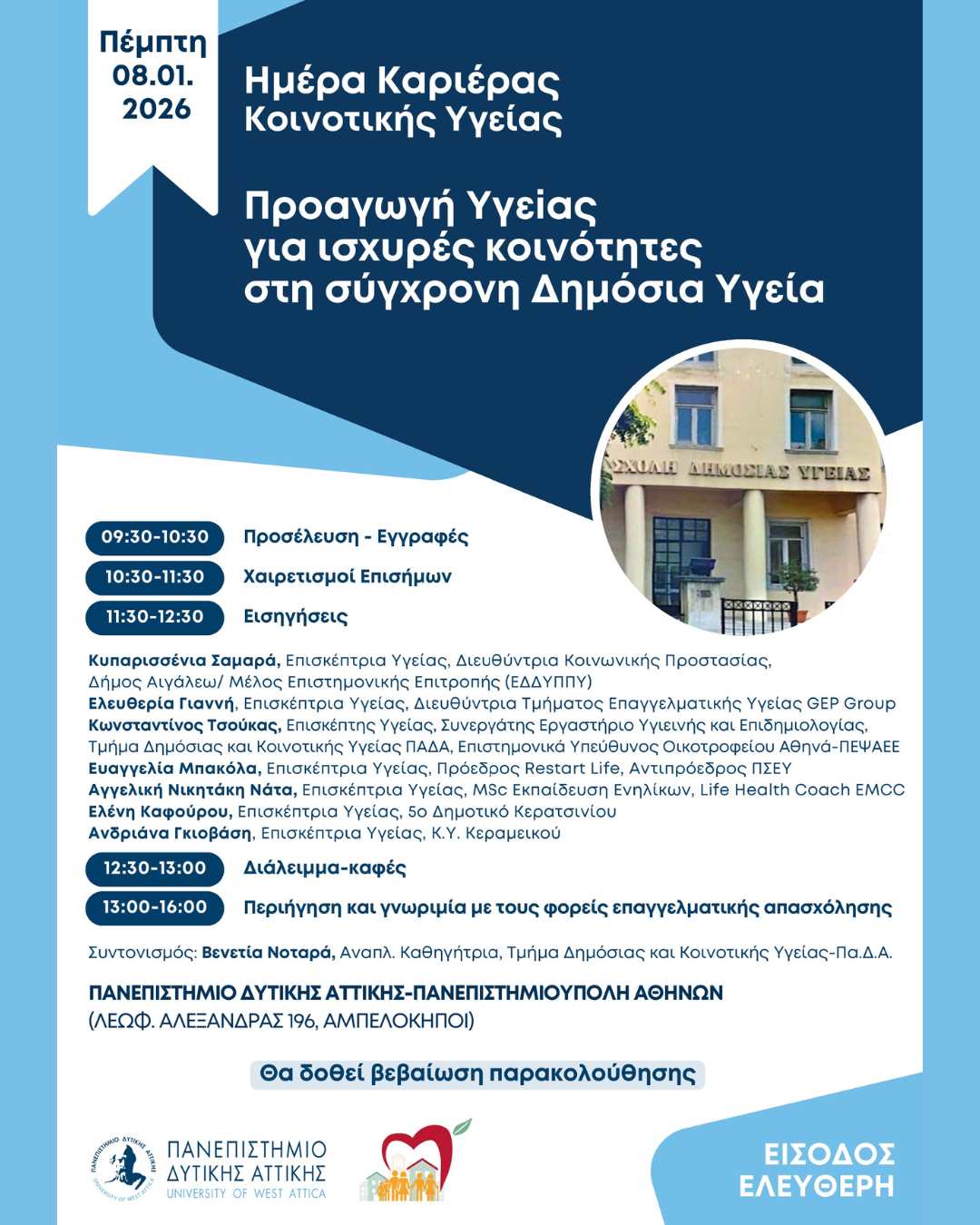 Το Τμήμα Δημόσιας και Κοινοτικής Υγείας, του Πανεπιστημίου Δυτικής Αττικής, σας προσκαλεί στην Ημέρα Καριέρας Κοινοτικής Υγείας με θέμα: «Προαγωγή Υγείας για ισχυρές κοινότητες στη Σύγχρονη Δημόσια Υγεία».