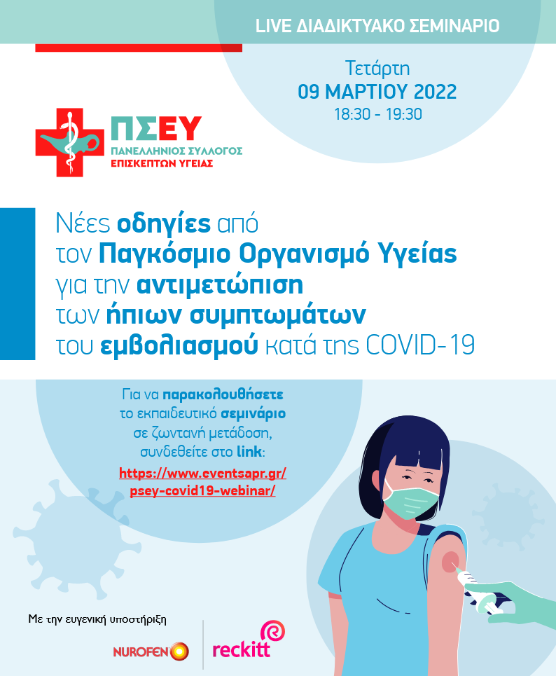 Ο Πανελλήνιος Σύλλλογος Επισκεπτών υγείας διοργάνωσε την Τετάρτη 09 Μαρτίου 2022 ένα live διαδικτυακό σεμινάριο με θέμα «Νέες οδηγίες από τον Παγκόσμιο Οργανισμό Υγείας για την αντιμετώπιση των ήπιων συμπτωμάτων του εμβολιασμού κατά της COVID-19» με την ευγενική χορηγία του NUROFEN / Reckitt.